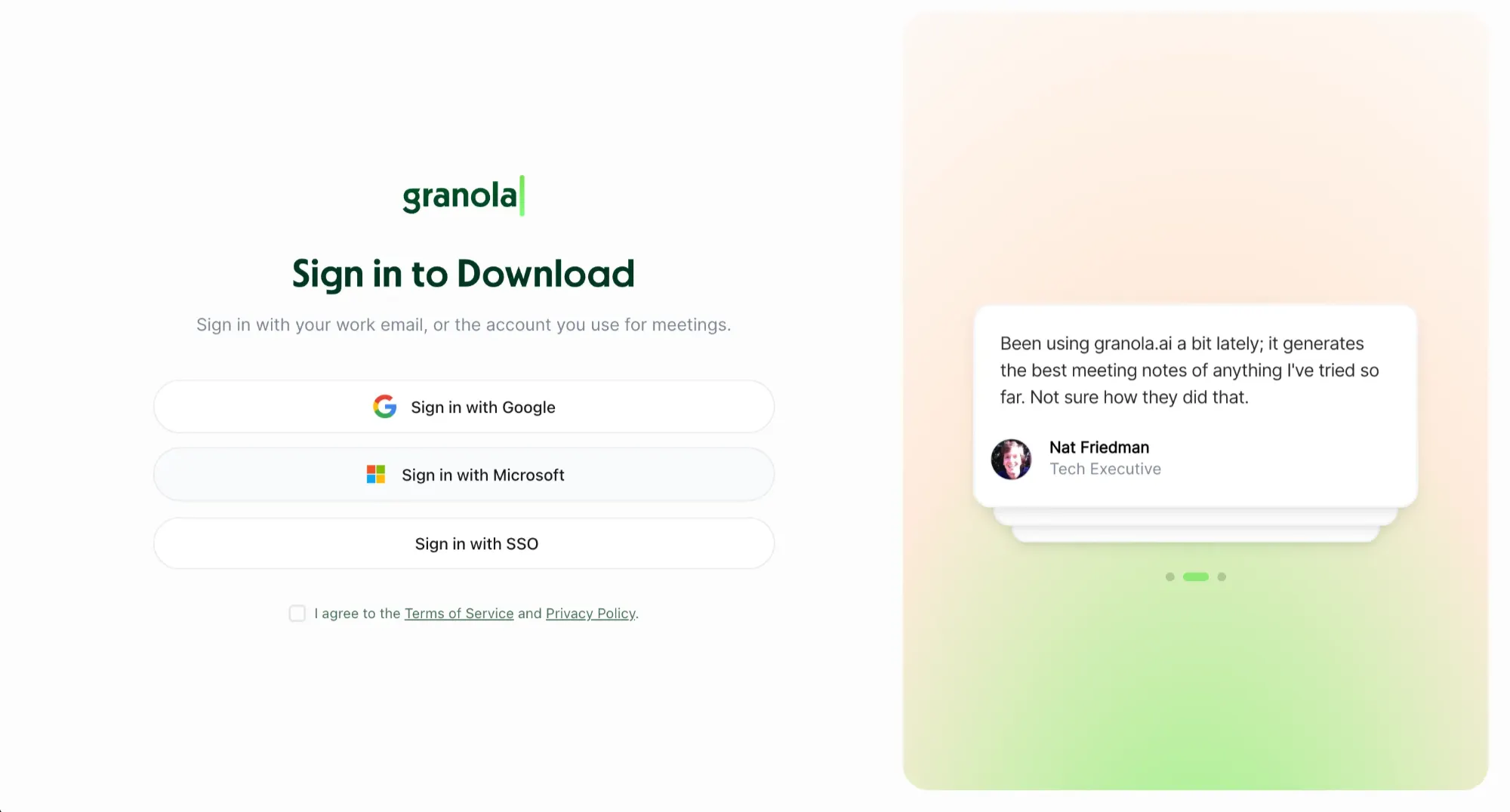 Because Granola is a desktop app, there’s a bit of friction for you to get started. You can't just sign up and start using it in your browser. Instead, you visit the website, download a desktop app, install it, and then sign in again.