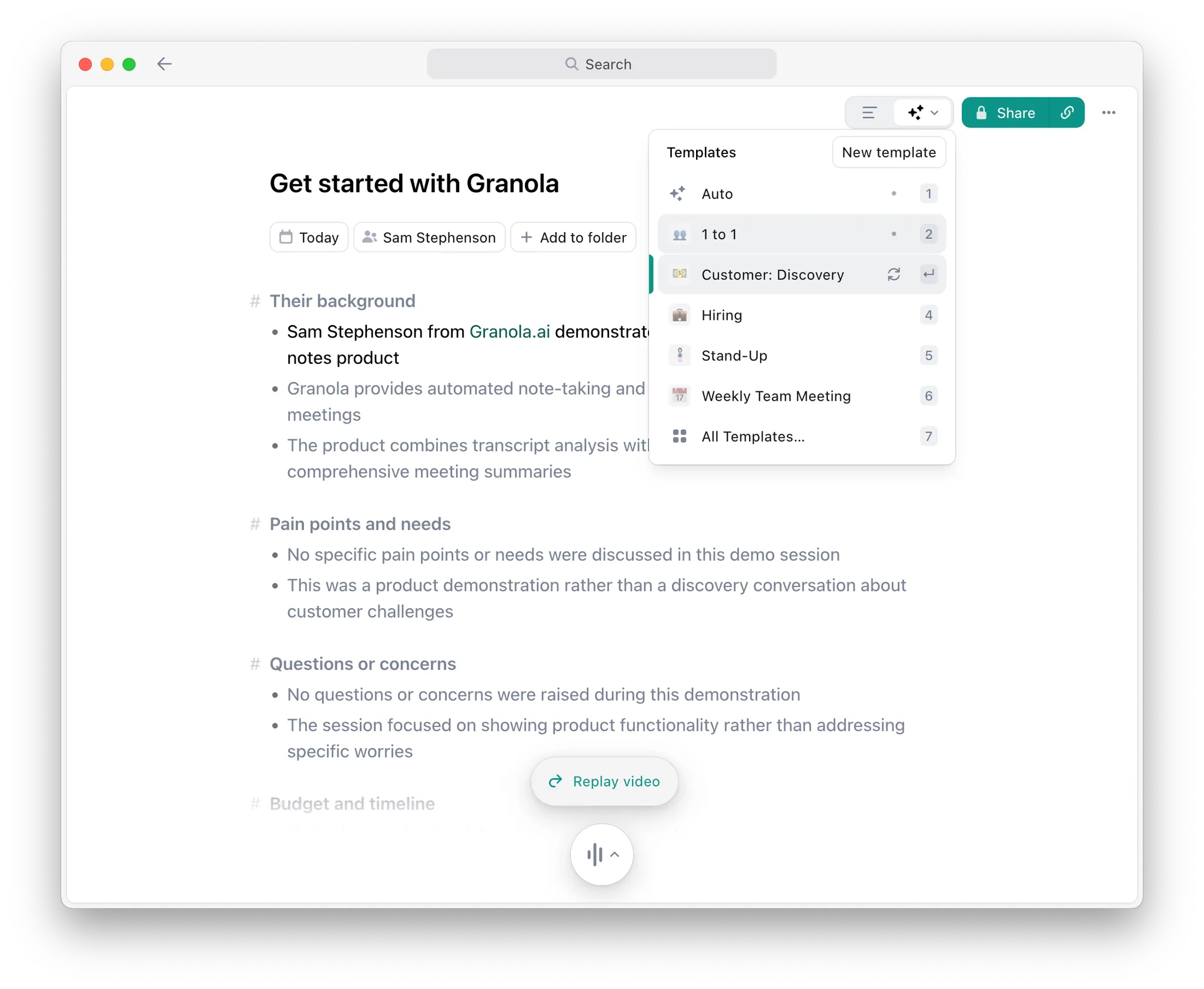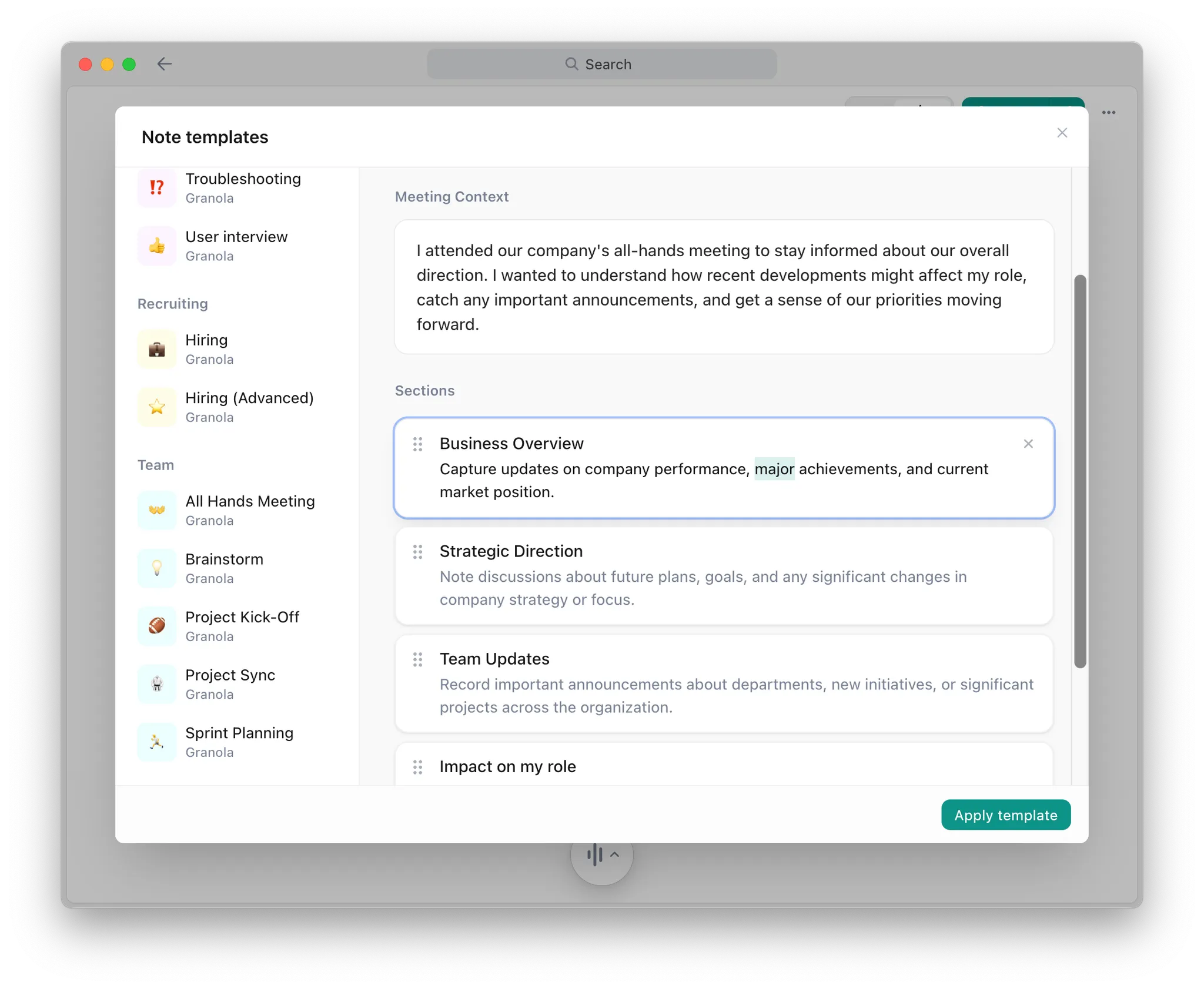 Most common meeting types are covered by the generic Granola templates. One-on-ones, standups, client calls, and the usual suspects are all there. When you click into the template library, there are even more to choose from, including any custom ones from your team or workspace.